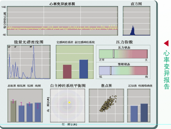 11.可分析指标:Mean HR、Min RR、Max RR、Mean RR、SDHR、SDNN、RMSSD、Pnn50、TINN、PSI、ApEn、SRD、TP、VLF、LF、HF、LF norm、HF norm、LF/HF ratio、心率曲线图、柱状图、图表、功率谱分析、压力指数分析等。